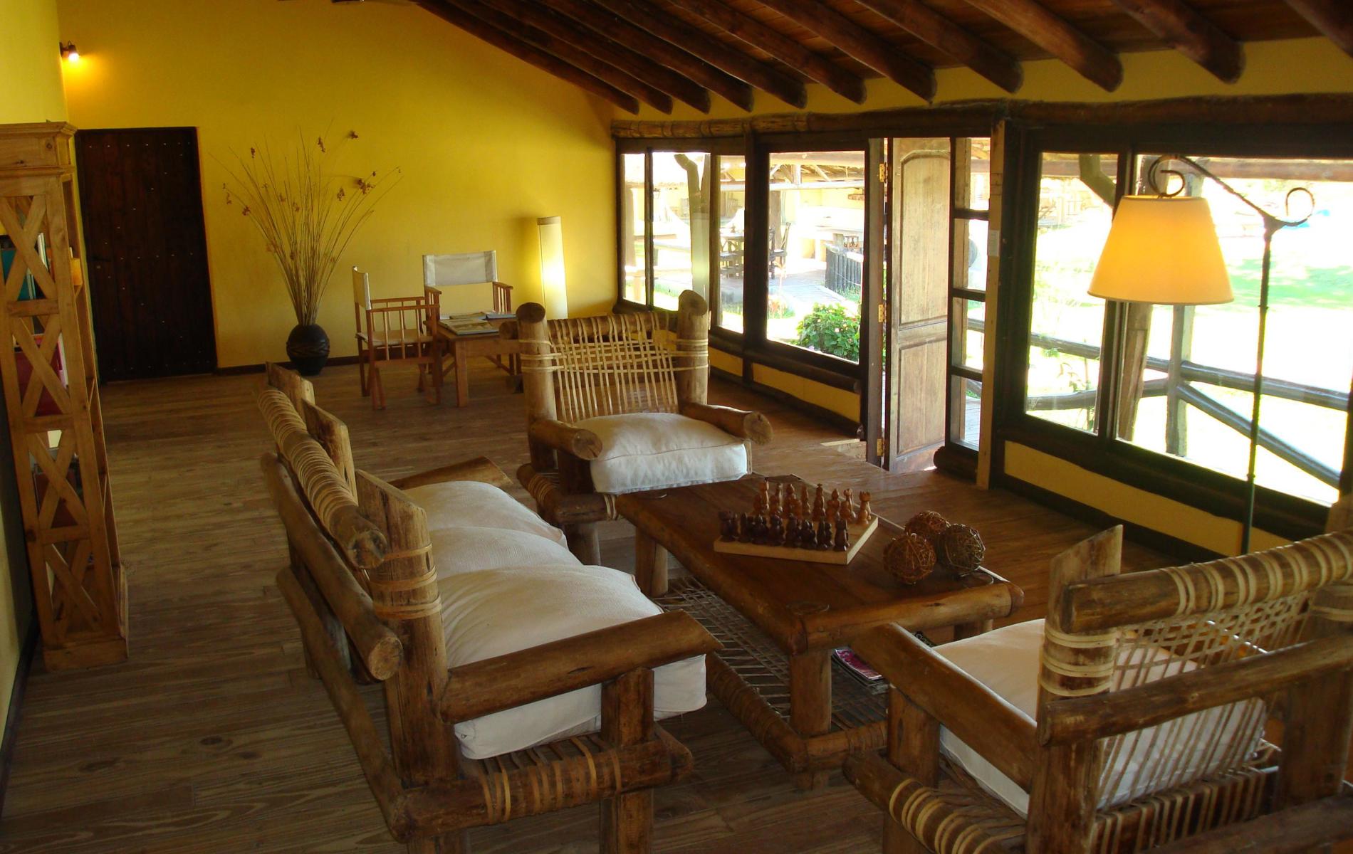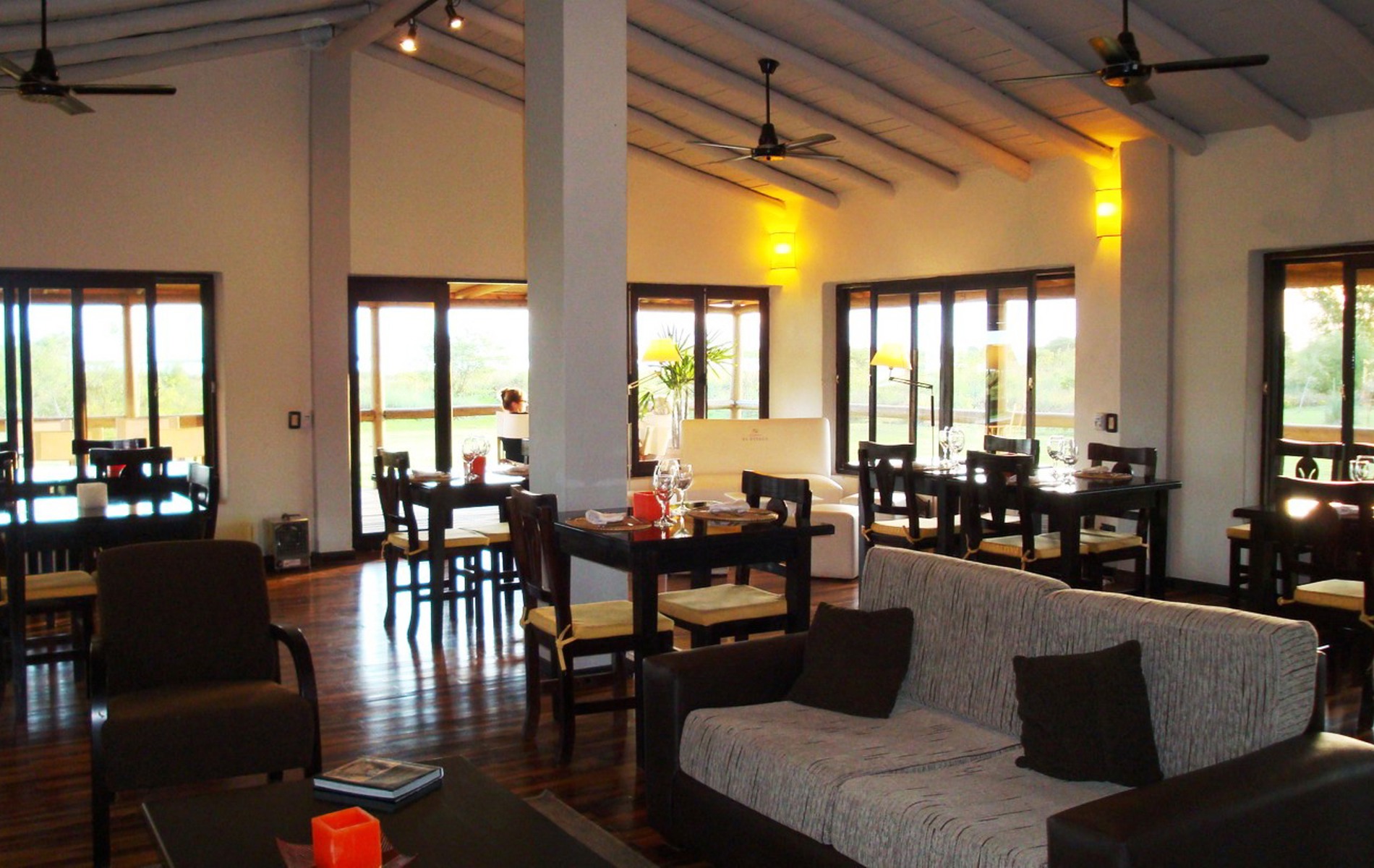 Lodgens centrale fælles rum er både pejsesture, reception, bar og resturant, og der er vindeuer fra luft til gulv til 2½ side. Hyggelig sted at opholde sig om aftenen og nyde den lokale og meget veltilberedte mad.