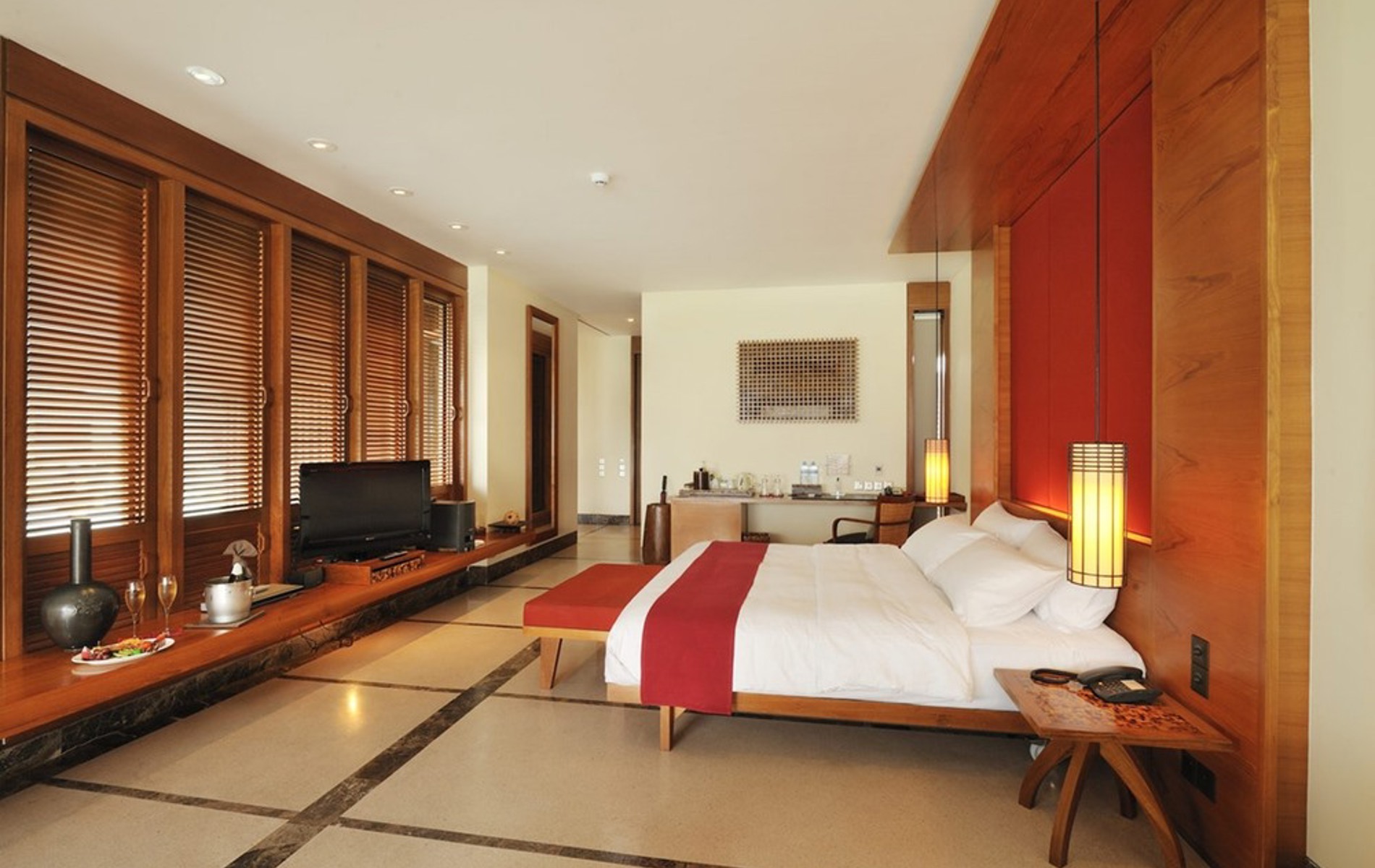 Beliggende lige bag strandens trægrænse, finder du det ultimative inden for tropisk luksus. Mens nogle værelser er fritliggende, er andre i blokke af to, perfekt til familier eller grupper. Hvide vægge og lofter sørger for en luftig og lys atmosfære. Blomstermønstre på gardinerne og sengetæpperne komplementerer de farverige vægge. Træd ind gennem hoveddøren til en flisebelagt veranda ud mod stranden, møbleret med behagelige liggestole - et idyllisk sted for en eftermiddag med læsning eller nyde havbrisen.
